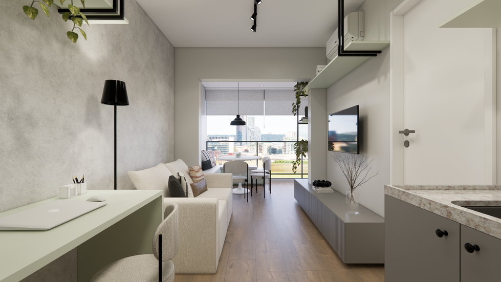 A unidade apresenta uma composição leve e contemporânea, marcada por soluções que valorizam a amplitude visual e o uso inteligente da metragem. A paleta em tons de cinza claro, verde suave e madeira natural cria um ambiente equilibrado, onde cada elemento se integra com naturalidade ao conjunto.
