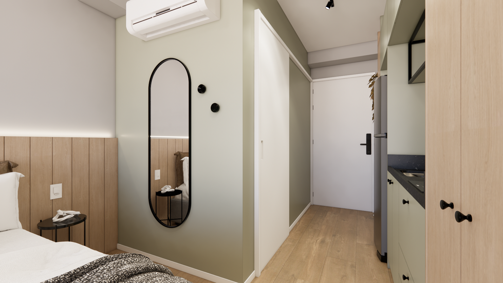 Este projeto transforma um studio compacto em um espaço fluido e altamente funcional, onde cada centímetro é aproveitado com inteligência. A marcenaria planejada integra cozinha, home office e armários em um único plano visual, criando um ambiente coeso e elegante. O uso de tons amadeirados e neutros, combinado à iluminação embutida e à composição minimalista, reforça a sensação de amplitude e conforto.