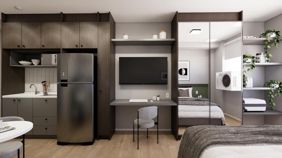 Um projeto Bwild que transforma o studio em um espaço prático e elegante, onde cada elemento é desenhado para valorizar a experiência de morar bem.